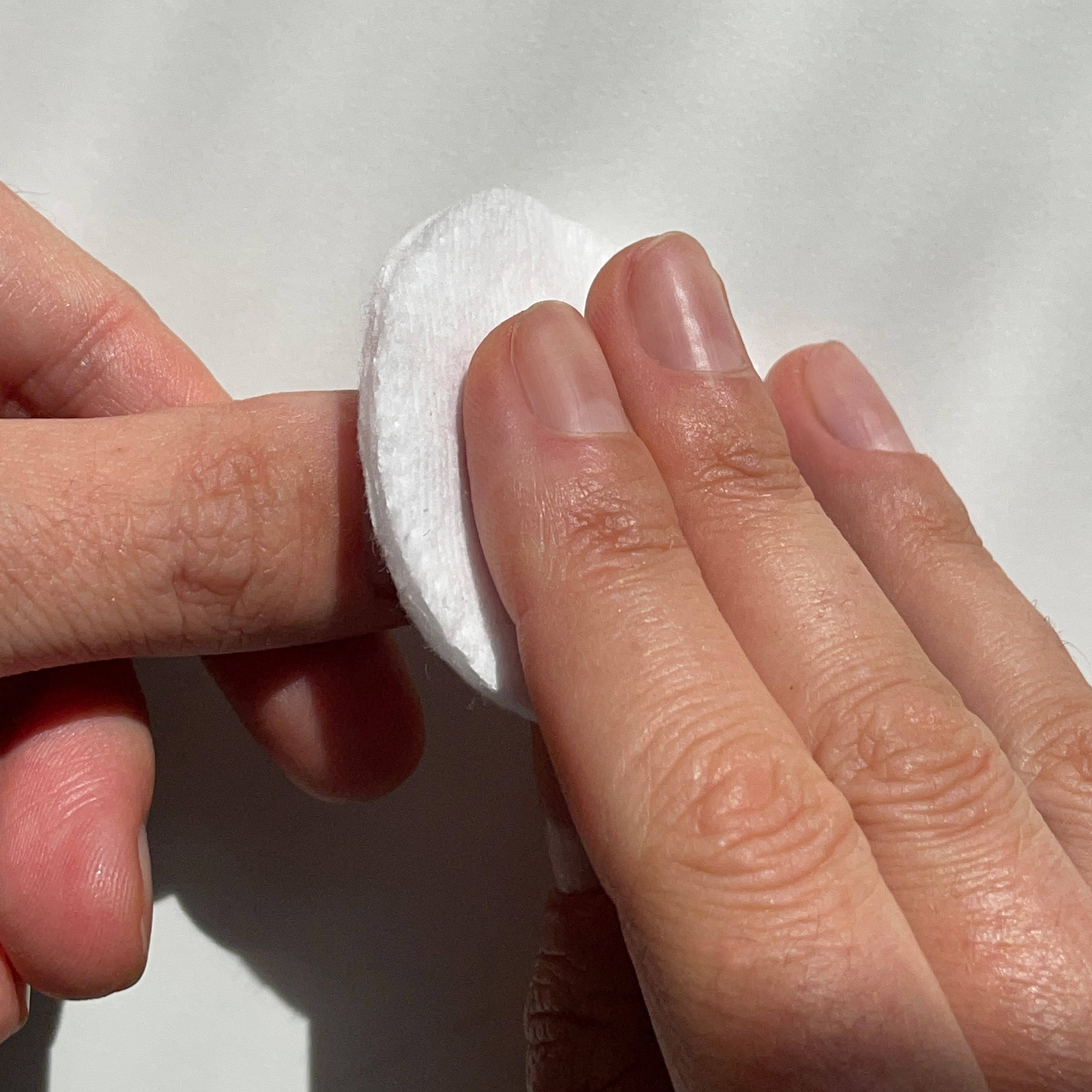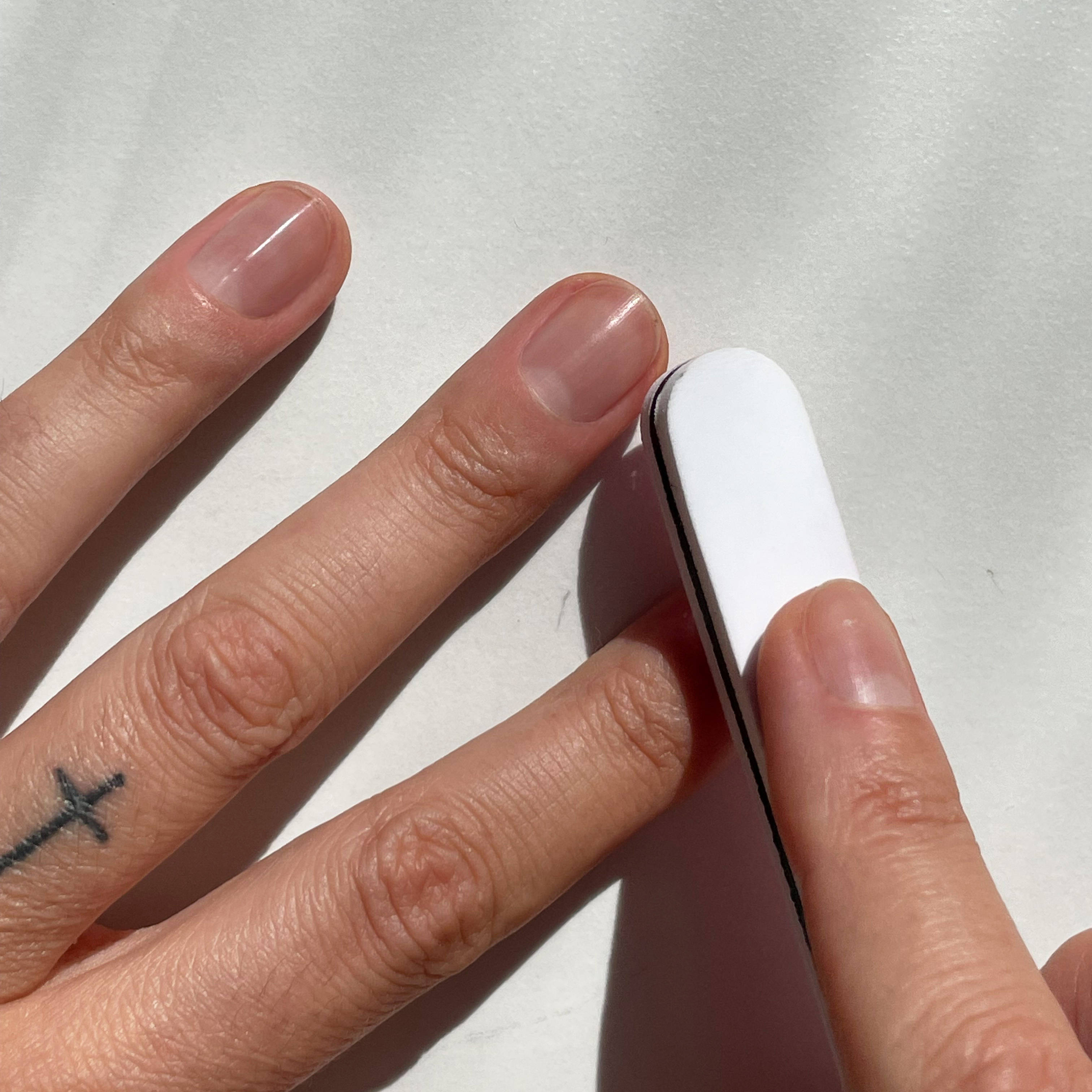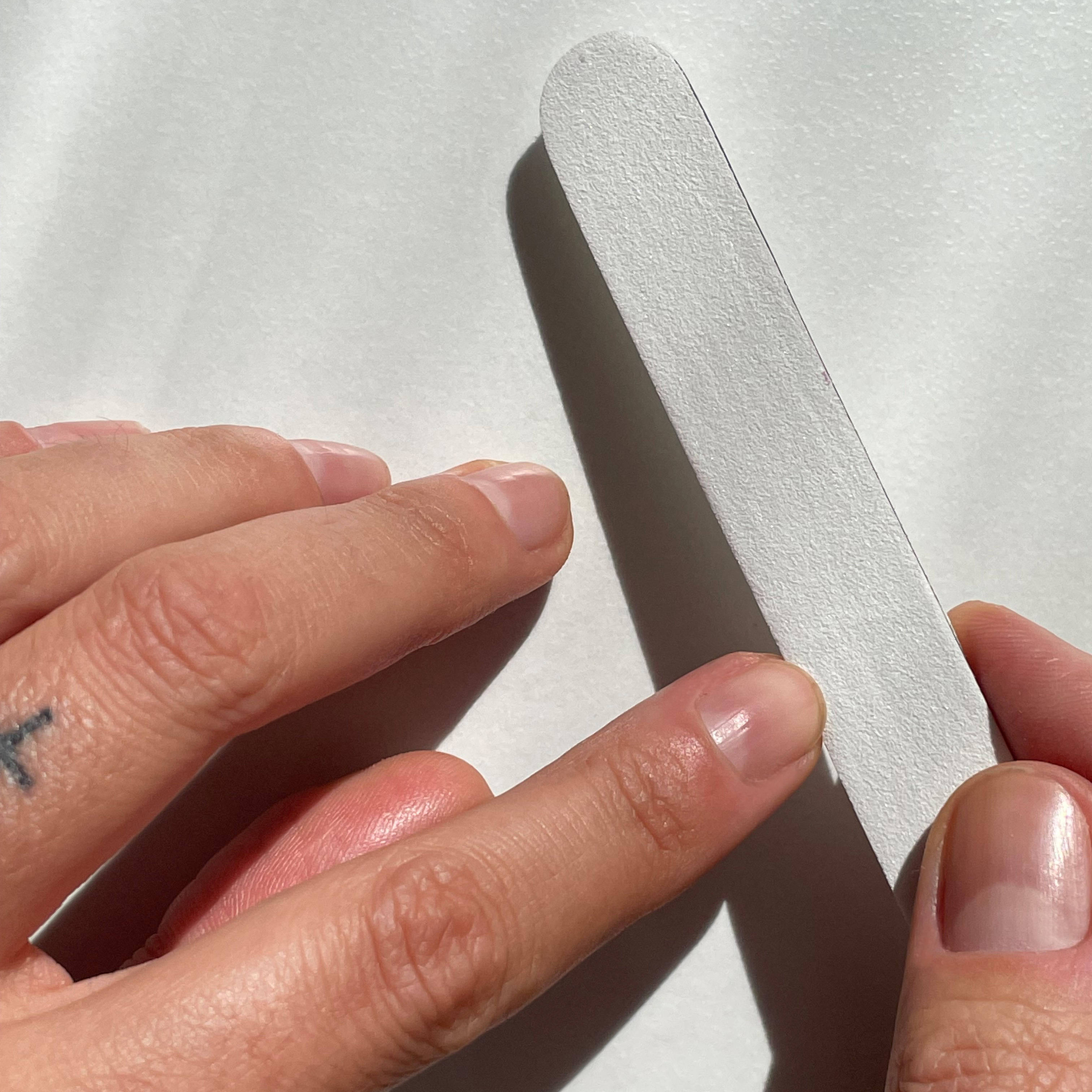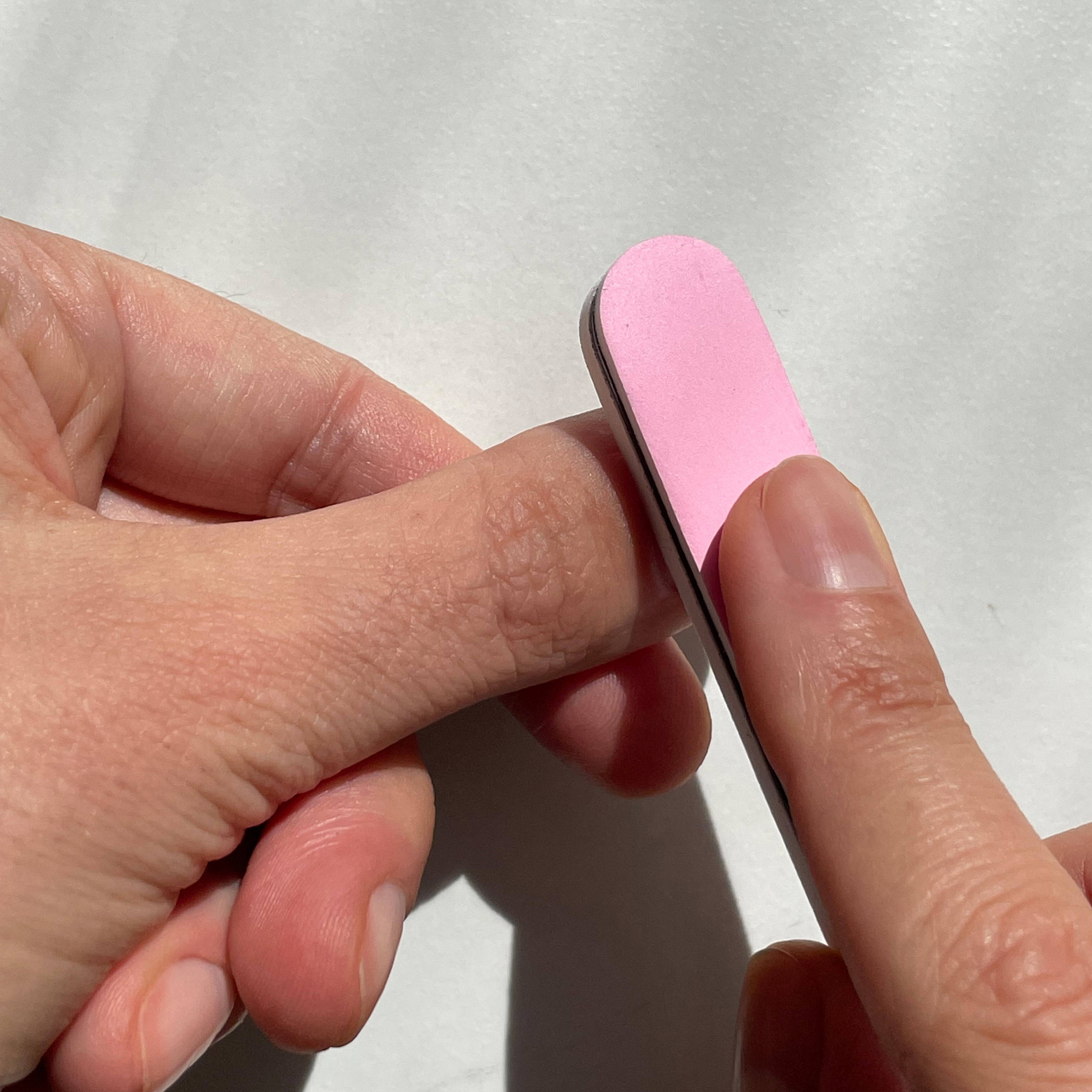 Now the polishing file comes into play. I gently clean the nail with the pink side. The special coating of the polishing file gently removes small residues, as well as bumps and discolorations.