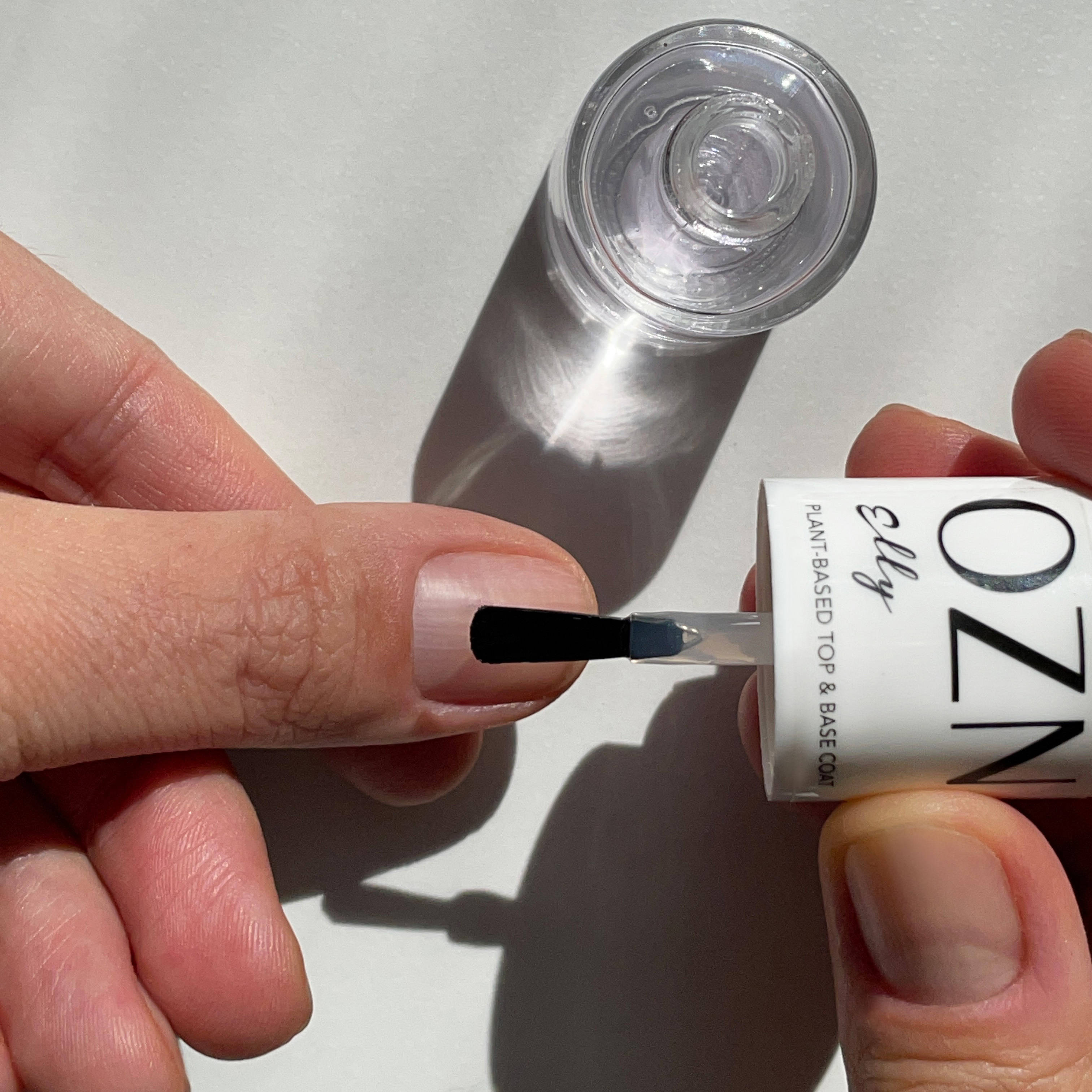Now I apply our Top & Base Coat Elly. It dries quickly and is the optimal preparation for any manicure. The base coat simplifies the application of the color lacquer and at the same time increases the durability. The color is fixed and chipping is prevented. Those who have very uneven nails can also use our plant-based ridge filler Anabell, it evens out grooves and irregularities in the nail plate and gives the nails a more even surface. This makes the nails look wonderfully smooth and even.